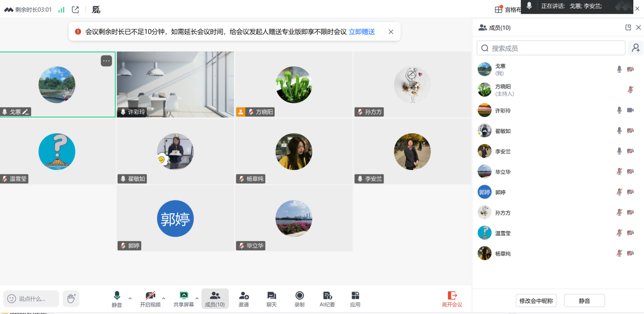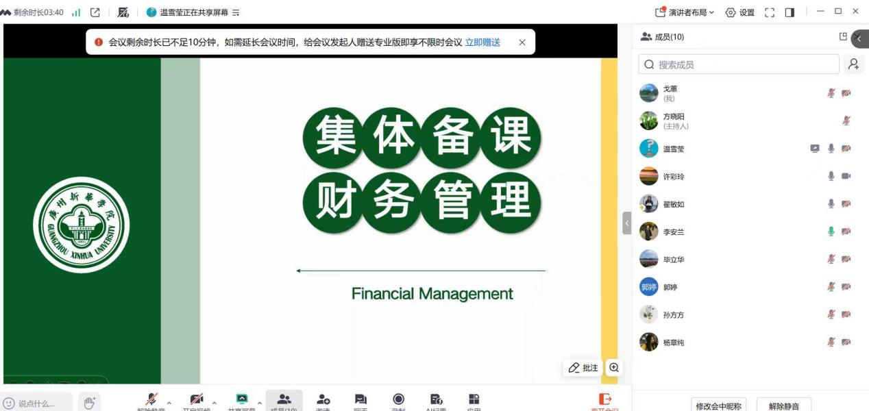 2025年9月17日晚,财务管理课程组通过腾讯会议平台开展集体备课研讨。本次会议由财务管理课程负责人许彩玲副教授主持,李安兰书记、郭婷、孙方方、毕立华、戈蕙、温雪莹、方晓阳、杨章纯、翟敏如共10位老师参加。会议围绕“经验共享,激发学生兴趣”、“教学策略研讨”、“互动教学方法碰撞”、“教学资源共建共享”等核心议题展开深入研讨,凝聚集体智慧,优化教学策略。