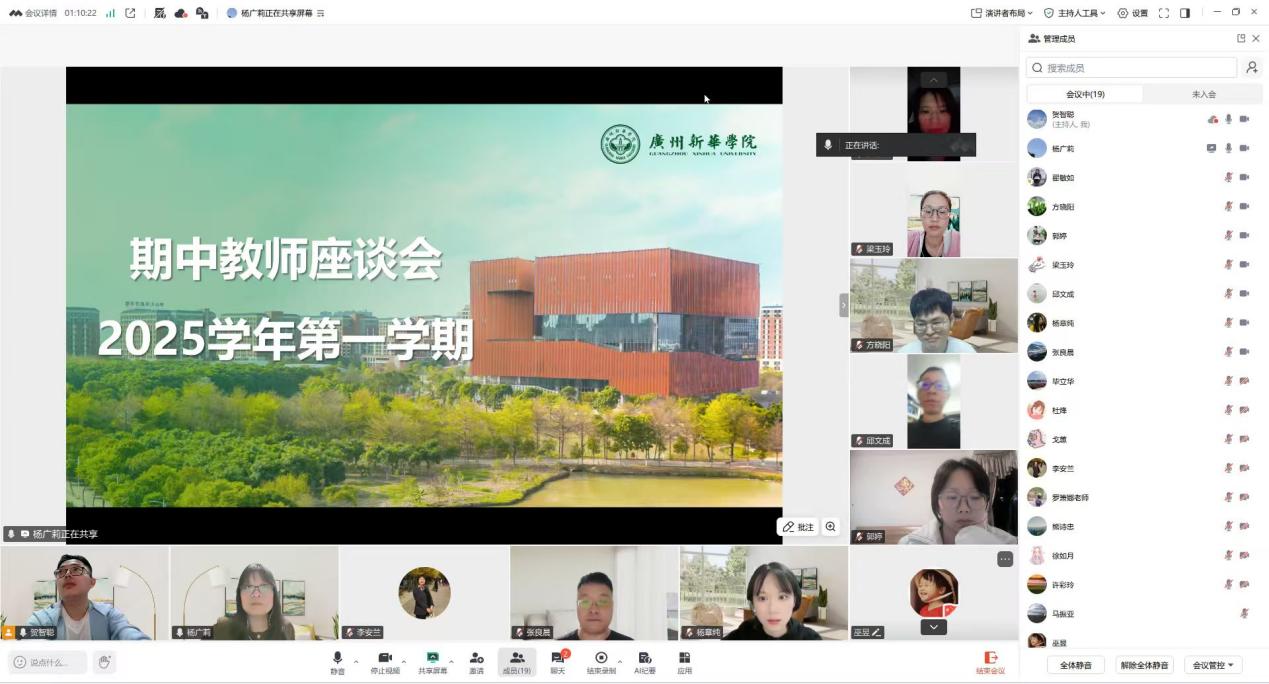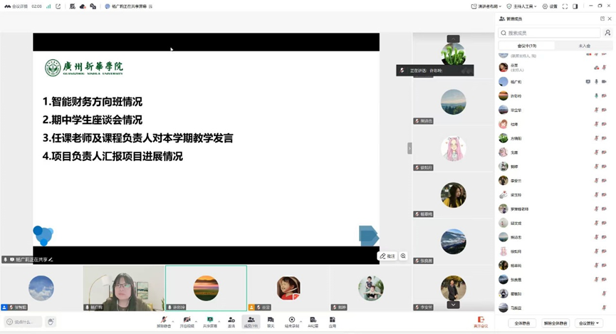 2025年11月13日20:00-21:30,广州新华学院会计学院财务管理系以线上腾讯会议形式顺利召开期中教学研讨会。本次会议旨在复盘学期过半教学成效、破解教学痛点、凝聚育人共识,由财务管理系杨广莉主任主持,会计学院总支书记李安兰及财务管理系全体专任教师共同参会,围绕教学实践、课程建设、智能赋能等核心议题展开深入研讨。
