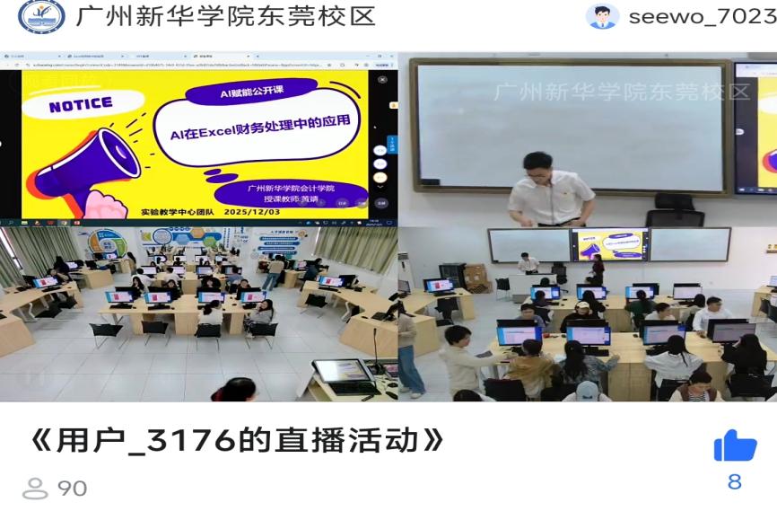 为响应数字化时代财会人才培养需求,探索智能化技术与多课程深度融合的教学新路径,2025年12月3日下午第8-9节课,会计学院实验教学中心在东莞校区格物1A503课室成功举办《AI在Excel财务处理中的运用》示范课活动。本次课程由实验教学中心主任黄靖主讲,是中心“多课程智能化技术融合”的创新尝试,吸引了众多教师现场观摩学习,同时通过希沃平台进行课程直播,累计吸引九十多名老师线上观看。
