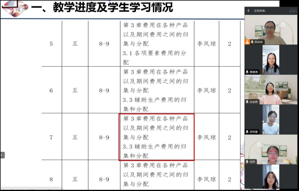 会议首先由李凤琼老师对成本会计课程的教学及学生学习情况进行了总结。她指出了成本会计教学工作正按计划稳步推进,大部分学生能够积极参与课堂学习并高质量完成课后作业。但也有部分学生在一些复杂知识点的理解上存在困难,教师们针对这一情况进行了深入讨论,提出了加强个别辅导、组织小组讨论等针对性措施,以确保每一位学生都能跟上教学进度。