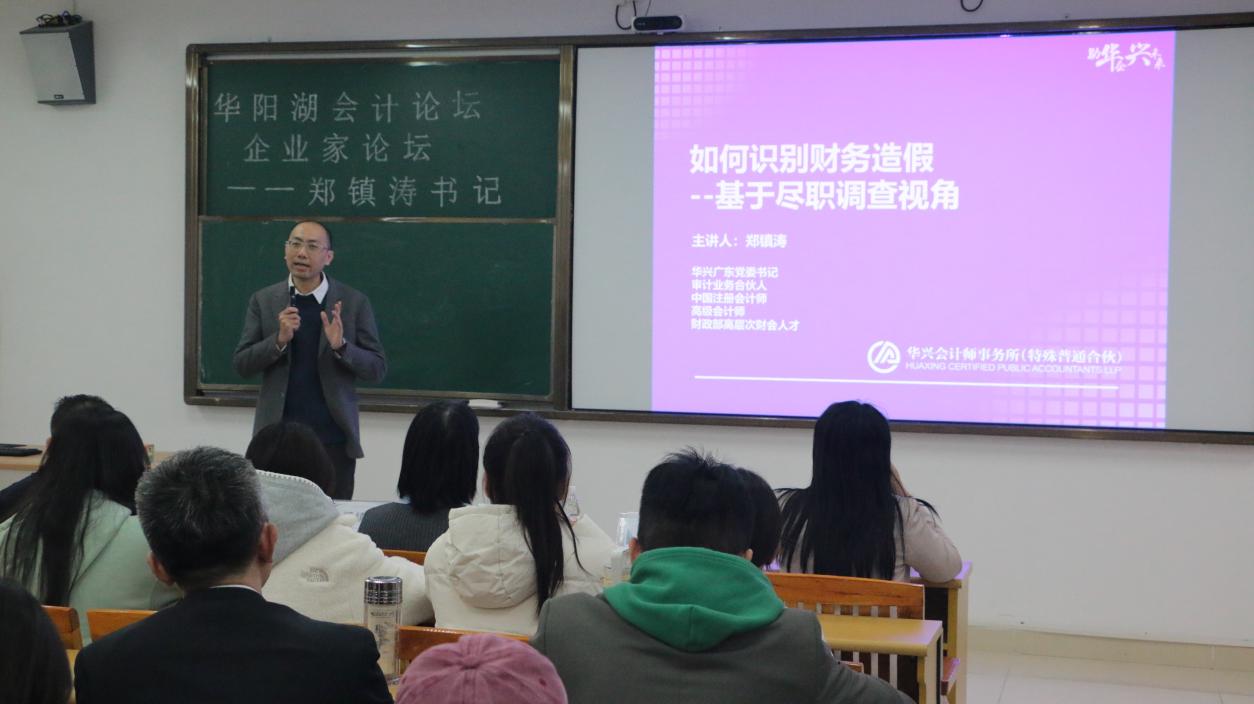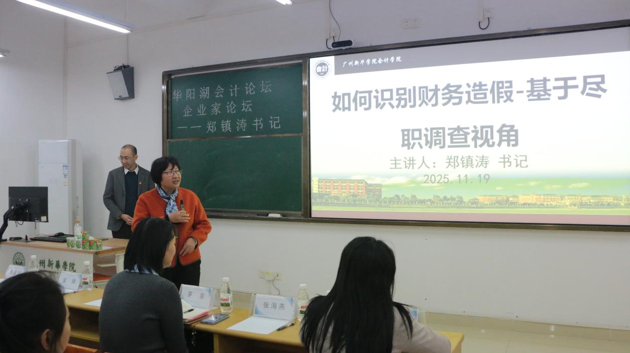 2025年11月19日下午,广州新华学院会计学院在东莞校区定静楼③210成功举办了新一期“华阳湖会计论坛—企业家论坛”。本次论坛主题为“如何识别财务造假——基于尽职调查视角”,特别邀请了中共华兴广东党委书记、审计业务合伙人郑镇涛教授担任主讲嘉宾。论坛由会计学院党总支书记兼副院长李安兰主持,出席嘉宾包括会计学院副院长(主持工作)吴翔、副书记邓楚云、院长助理吴津钰、办公室主任莫燕银,以及学院部分师生共同参与。